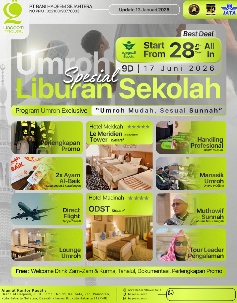 Assalaamu’alaykum Wr. Wb. Paket Umroh Awal Musim 2026 telah dibuka. Promo Pendaftaran bersama dengan biro travel kami Haqeem Travel
